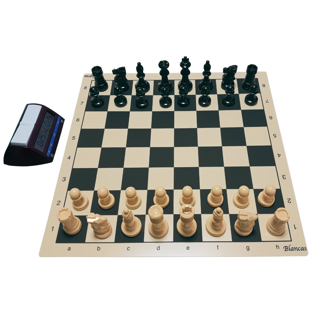 Conjunto. Tablero rígido PVC 45x45cm con piezas Staunton 5/6 oficiales FDE plástico y Reloj DGT 2010.
