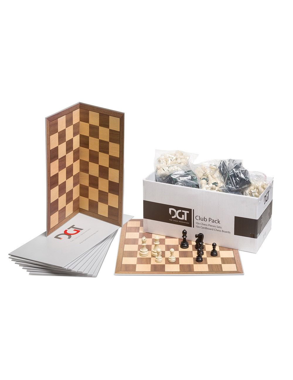 El DGT Club Pack es ideal para clubes y agrupaciones de ajedrez. Contiene 10 juegos completos de piezas DGT plástico de 95mm y tableros plegables de cartón denso de 55cm2.